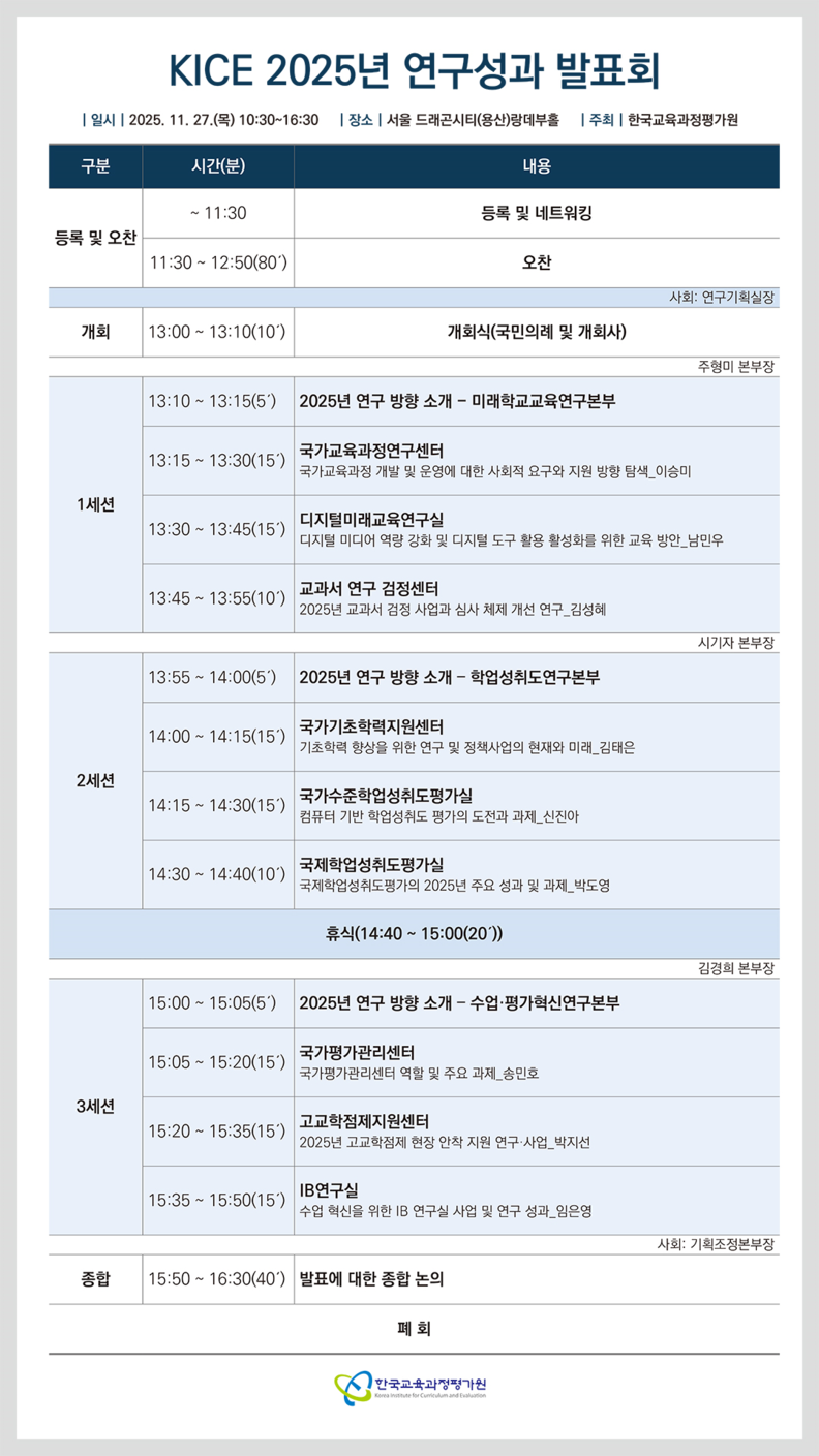 총 3개 연구 본부(미래학교교육연구본부, 학업성취도연구본부 수업평가혁신연구본부)의 9개 실센터의 연구성과가 발표된다. 평가원은 이번 연구성과 발표회를 공식 유튜브 채널 통해 생중계하고, 향후 발표 영상 등을 공개할 예정이다.