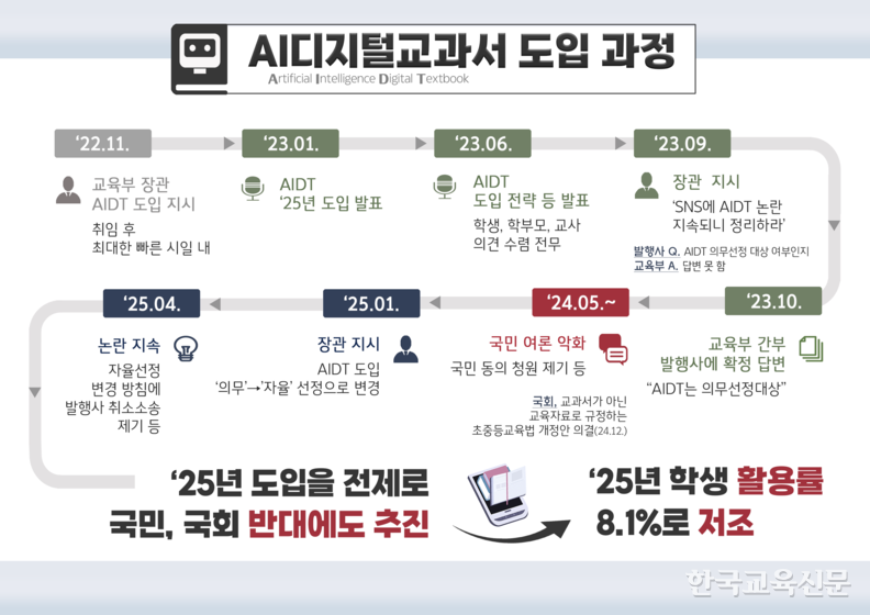 2025학년도부터 단계적 도입을 추진했던 AI디지털교과서(AIDT)가 준비 과정과 검정 절차 전반에서 다수의 미흡 사항이 확인됐다. 정책 추진 초기 단계에서 충분한 검증 절차가 확보되지 않았고 그 부담이 학교 현장으로 이어졌다는 것이다.