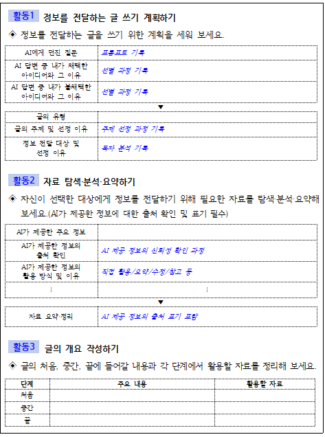 이에 따르면 교사는 수행평가 시행 전에 과목별 평가 요소와 채점 기준 등을 고려해 AI 활용에 대한 구체적인 기준을 마련한다. 수행평가에서 AI를 활용할 경우 출처 등 활용 과정을 명확히 표기하고 개인정보 입력 및 처리에 주의하도록 지도한다. 학교는 AI를 활용한 평가에서 학생들이 유의해야 할 사항을 충분히 안내하고, 올바른 AI 활용 역량을 기를 수 있도록 관련 교육을 진행한다. 교사는 평가의 신뢰성을 높이기 위해 수업 시간에 학생의 수행 과정을 직접 관찰할 수 있는 실시간 활동 중심의 평가를 운영하게 된다.