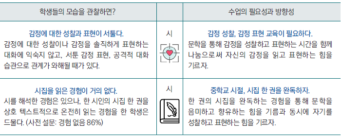 한 권의 시집을 완독하고 감상을 공유하는 과정을 통해 자신의 감정을 성찰하고, 표현하는 힘을 기르고자 한다. 감정 성찰과 표현의 과정과 한 권의 시집 완독 경험을 통해 관계를 형성하는 힘과 치유와 회복 탄력성을 길러 관계를 형성하고 지속하는 기술·지식·태도를 습득하고자 한다.