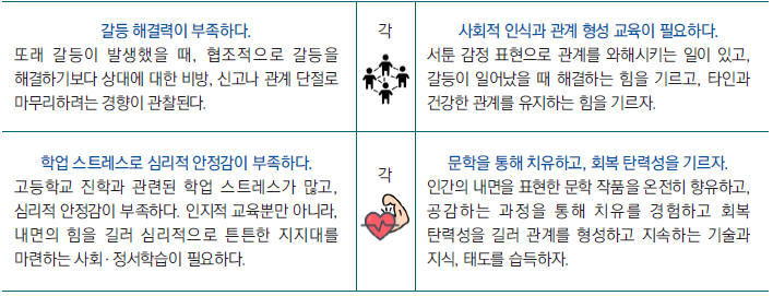 서로 관계를 형성하고, 갈등을 해결하는 힘을 길러야 할 중요한 초등 고학년 시기에 원격수업과 등교수업을 병행하면서 학생들은 자아를 탐색하고, 관계성을 형성하는 시간을 온전히 누리기 어려웠다. 우리 학생들의 현재 상황에 대한 관찰과 사회정서를 돌보는 수업의 필요성과 방향성을 바탕으로 공감과 협력을 배우고, 정서적 안정과 긍정적인 학교 문화를 형성하기 위한 문학 수업을 계획하고자 했다.