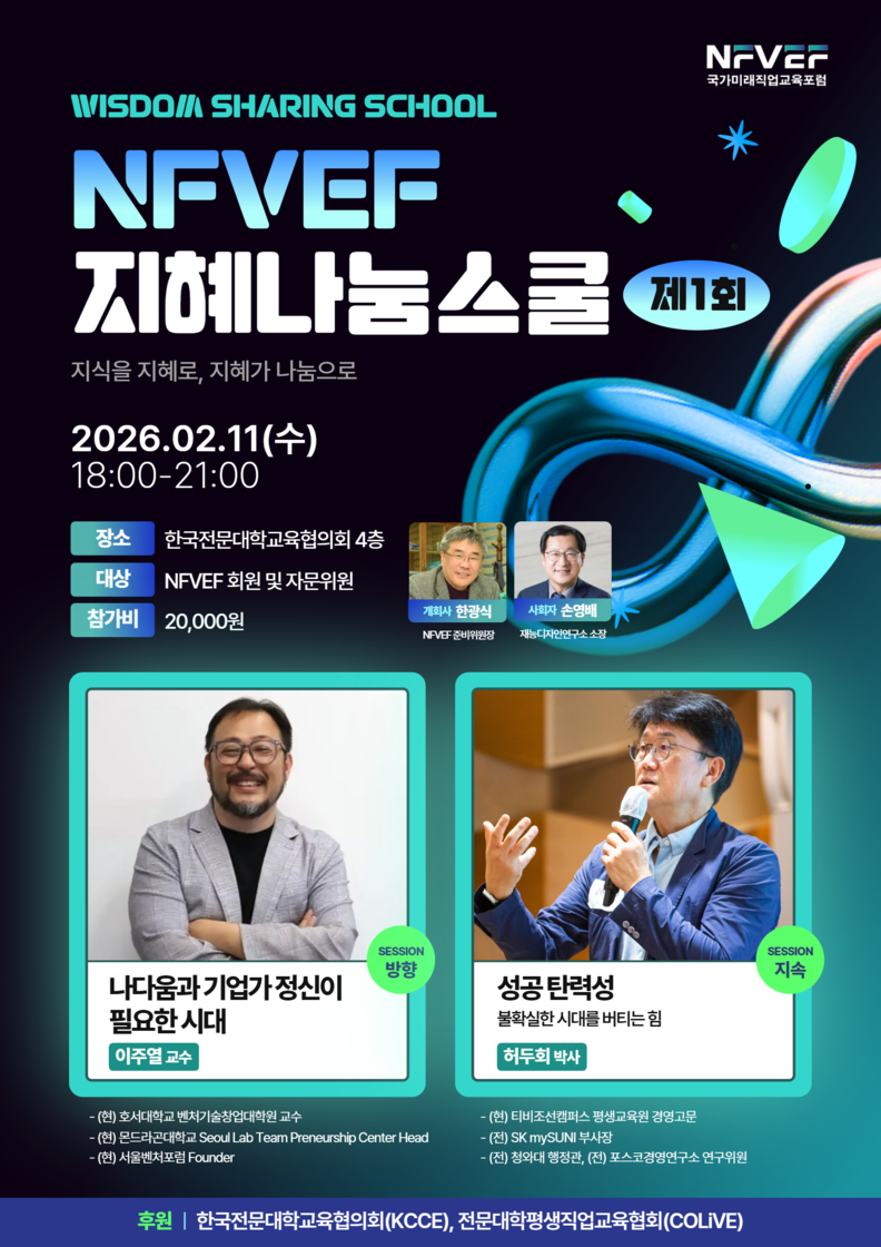 국가미래직업교육포럼(NFVEF, 위원장 한광식)은 오는 11일 오후 6~9시 서울 중구 한국전문대학교육협의회(전문대교협) 대회의실에서 ‘제1회 NFVEF 지혜나눔스쿨(Wisdom Sharing School, WSS)’을 개최한다고 9일 밝혔다.