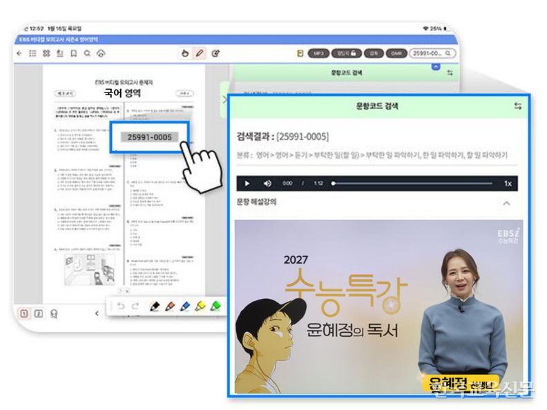 이번 eBook 서비스의 핵심은 ‘문항별 원스톱 서비스’다. 교재에 수록된 문항 코드를 터치하면 정답과 해설은 물론, 해당 문항과 연결된 EBSi 강의까지 즉시 확인할 수 있도록 했다. 그동안 수험생들이 문제를 풀다 해설지를 따로 찾거나 강의를 검색해야 했던 과정을 줄여 학습 흐름을 끊기지 않게 하겠다는 설명이다.