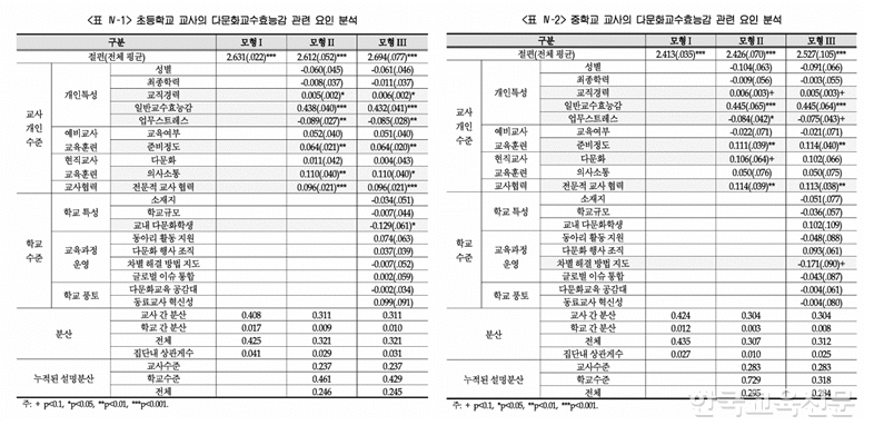 반면 학교 수준 요인에서는 초등과 중등이 일부 다른 양상을 보였다. 초등학교에서는 교내 다문화학생 비율이 -0.129로 나타나, 다문화학생이 많은 학교일수록 교사의 효능감이 낮아질 가능성도 확인됐다. 학교 차원에서 다문화학생 증가에 걸맞은 지원 체계가 충분히 구축되지 못할 경우 교사 부담이 커질 수 있다는 점이 함께 드러난 셈이다.