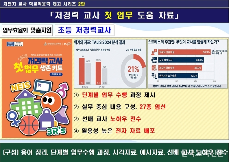 이번 자료는 지난해 배포한 ‘새내기 교사 첫 출근 도움 자료’에 이은 두 번째 시리즈로, 학교 현장에서 저경력 교사들이 실제로 자주 맡게 되는 핵심 업무 27종을 엄선해 수록했다. 특히 신규·저경력 교사들이 업무를 처음 접할 때 겪는 혼란과 부담을 줄이고, 실무 적응 속도를 높이기 위한 목적에서 기획됐다.