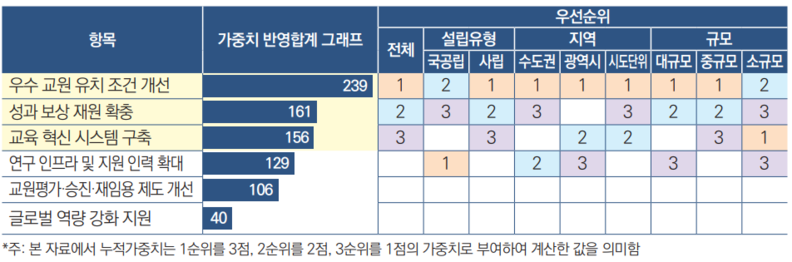 교원 경쟁력 강화를 위해 우선적으로 투자가 필요한 영역에 대한 문항에서 가중치 반영 결과 ‘우수 교원 유치 조건 개선’이 1순위(239점)로 나타났다. 2순위는 ‘성과 보상 재원 확충’(161점), 3순위는 ‘교육 혁신 시스템 구축’ (156점) 등이었다.