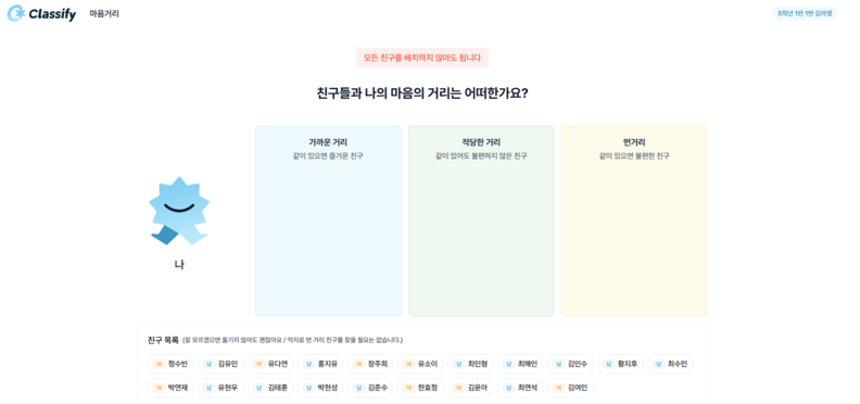 교우관계를 파악하는 마음거리검사는 방법이 쉽고 직관적이다. 여러 질문을 읽고 답하는 설문형태가 아니라, 가까운 거리, 보통 거리, 먼 거리 3칸으로 나뉜 표에 친구 이름을 드래그 앤 드롭하는 방식이어서 누구나 간단히 할 수 있다. 또한 가까운 경우는 친구의 ‘장점’을, 먼 경우는 ‘사건’을 적도록 해 정성적인 부분까지 알 수 있게 했다. 인맥의 범위와 학생 간 심리적 거리는 인포그래픽과 매트릭스로 제공하며, 다회차 검사 시 관계 변화를 꺾은선 그래프로 살펴볼 수 있다.