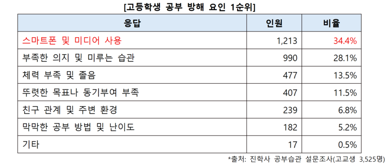 진학사가 지난달 2~11일 전국 고교생 3525명을 대상으로 설문조사를 진행한 결과, 응답자의 34.4%가 공부에 가장 방해가 되는 요소(1순위)로 ‘스마트폰 및 미디어 사용’을 선택했다고 4일 밝혔다. ‘부족한 의지’(28.1%)와 ‘체력 부족’(13.5%)이 그 뒤를 이었다.