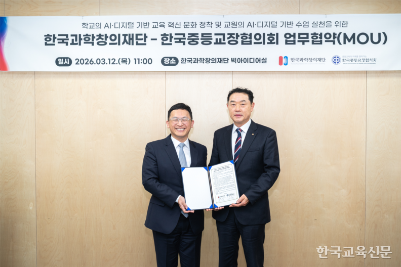 한국과학창의재단과 한국중등교장협의회(회장 남경민)가 인공지능(AI) 대전환 시대에 발맞춰 학교 교육 혁신을 위한 업무협약을 체결했다. 양 기관은 12일 한국과학창의재단에서 협약식(사진)을 열고, AI·디지털 기반의 교육 문화 정착과 교원들의 수업 실천 지원을 위한 상호 협력을 강화하기로 했다.