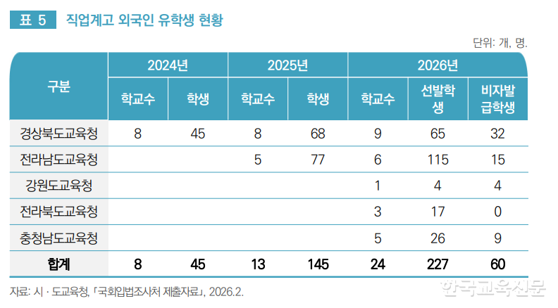 보고서에 따르면 직업계고 외국인 유학생은 경북교육청이 2024학년도 45명을 처음 유치한 이후 2025학년도 145명으로 증가했다. 그러나 2026학년도에는 5개 시도교육청이 선발한 227명 가운데 실제 비자를 발급받은 학생은 60명에 그친 것으로 나타났다.