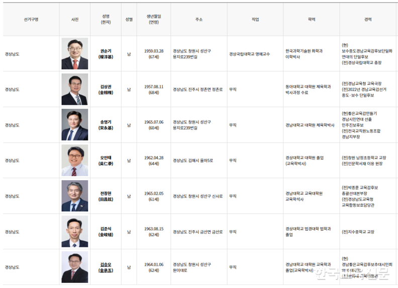 박종훈 교육감이 연임 제한에 걸린 경남은 전국에서 가장 많은 7명의 예비후보가 등록해 다자구도를 형성했다. 권순기 전 경상국립대 총장, 김상권 전 경남교육청 교육국장, 송영기 전교조 경남지부장, 오인태 전 창원남정초 교장, 김준식 전 지수중 교장, 김승오 전 청와대 교육행정관이 표심대결을 하고 있다.