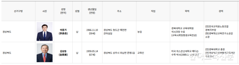 경북에서는 보수진영 예비후보 단일화가 성사됐다. 당초 김상동 전 경북대 총장, 마숙자 전 김천교육장, 임준희 전 대구교육청 부교육감, 이용기 전 전교조 경북지부장이 출사표를 던졌으나 마 전 교육장이 김 전 총장을 지지하고 불출마한데 이어 임준희 전 부교육감도 9일 김 전 총장 지지를 선언했다.