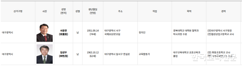 대구에서는 3파전이 예상된다. 3선에 도전하는 강은희 현 교육감에 서중현 전 서구청장이 일찌감치 도전에 나선 가운데 임성무 전 전교조 대구지부장도 지난달 25일 출마를 선언했다. 강 교육감은 보수, 서 전 구청장은 중도, 임 전 지부장은 진보 성향이다.