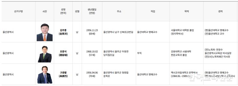 울산은 천장수 현 교육감이 지난달 초 일찌감치 불출마를 선언해 현직프리미엄이 없어진 가운데 김주홍 울산대 명예교수, 조용식 전 울산교육감 비서실장, 구광열 울산대 명예교수가 예비후보로 등록하고 각축을 벌이고 있다. 김 명예교수는 보수, 조 전 실장은 진보, 구 명예교수는 중도로 분류된다.