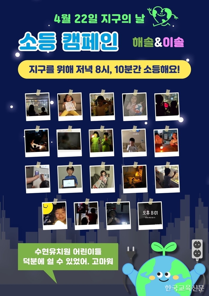 경기 수현유치원(원장 이귀열)이 22일 ‘지구의 날’을 맞아 기후 위기에 대응하고 탄소중립 실천 문화를 확산하기 위한 ‘전국 소등 행사’에 동참하며 학부모와 유아들의 큰 호응을 얻었다.