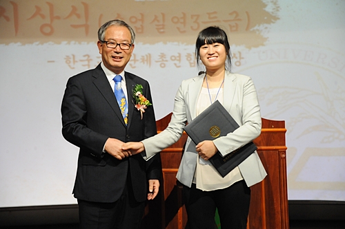 정윤정 부산교대 학생이 수업비평 부문 은상 수상자를 대표해 광주교대 총장과 악수를 나누고 있다.