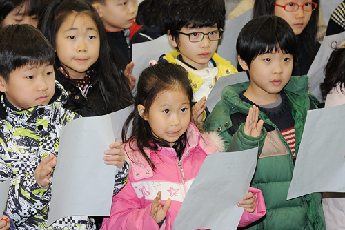 서울명덕초 학생들이 진지한 표정으로 선서를 하고 있다.