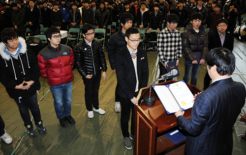 졸업생 대표 윤태선 학생(전교회장)이 재학생 대표 김창훈 학생에게 교복을 물려주고 있다.