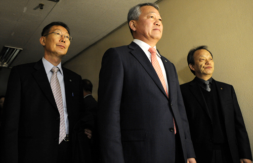 입을 굳게 다문채 회의장으로 향하고 있는 안양옥 회장과 진만성 서울교총 부회장(좌), 백복순 한국교육신문 사장(우)
