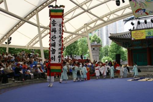 송파산대놀이는 옛 형태를 지닌 민중놀이로 중요무형문화재 제49호로 지정되어 있으며, 바가지, 소나무껍질, 종이 등으로 만든 탈 33개가 사용된다. 반주음악은 염불 리듬이 명확한 타령과 유창한 굿거리 곡 등을 사용하며 반주악기로는 피리, 젓대, 해금, 장구, 북 등이 사용된다.