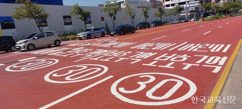둘째, 횡단보도 주변 도로에 미끄럼방지 유색포장을 도입해 도로가 붉은색으로 눈에 띄게 변했다. 또 도로 바닥에 ‘어린이보호구역’ 글자를 표시해 운전자들의 조심운전을 유도했다.