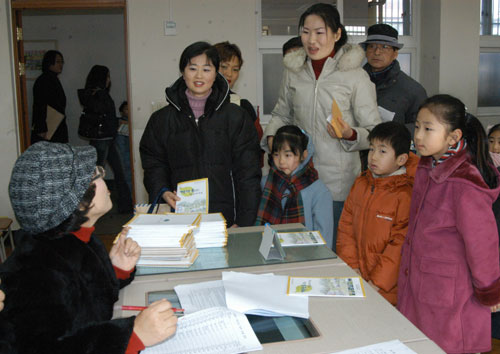 2005학년도 인천지역 초등학교 신입생 3만6405명에 대한 예비소집이 2일 오전 남동구 구월동 구월서초등학교(교장 이재훈)를 비롯한 각급 학교별로 일제히 실시됐다. 구월서초 취학아동 예비소집에 참가한 어린이들이 부모가 서류접수 하는 모습이 신기한 듯 지켜보고 있다.