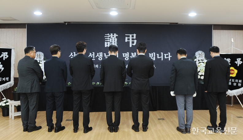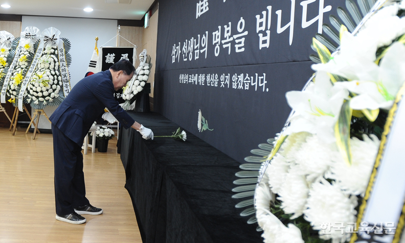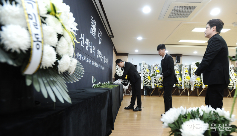 지난 4일 자택에서 숨진 충남 A중 교사의 추모 공간이 마련된 아산교육지원청 대회의실에 14일 추모객들의 발길이 이어지고 있다. 추모 공간은 17일까지 운영된다.