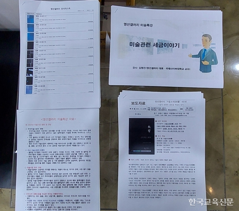 이어 김 대표는 2025년 미술시장 전망과 미술 관련 세금에 대해 짧은 특강을 이어갔다. 그는 “국내 미술시장은 꾸준한 성장세를 보이고 있으며, 특히 30~40대 젊은 컬렉터들이 활발히 참여하고 있다”고 말했다. 성공적인 미술품 투자를 위해서는 작품의 희소성, 작가의 경력, 시장 평가 등을 꼼꼼히 살펴야 한다는 조언도 덧붙였다.