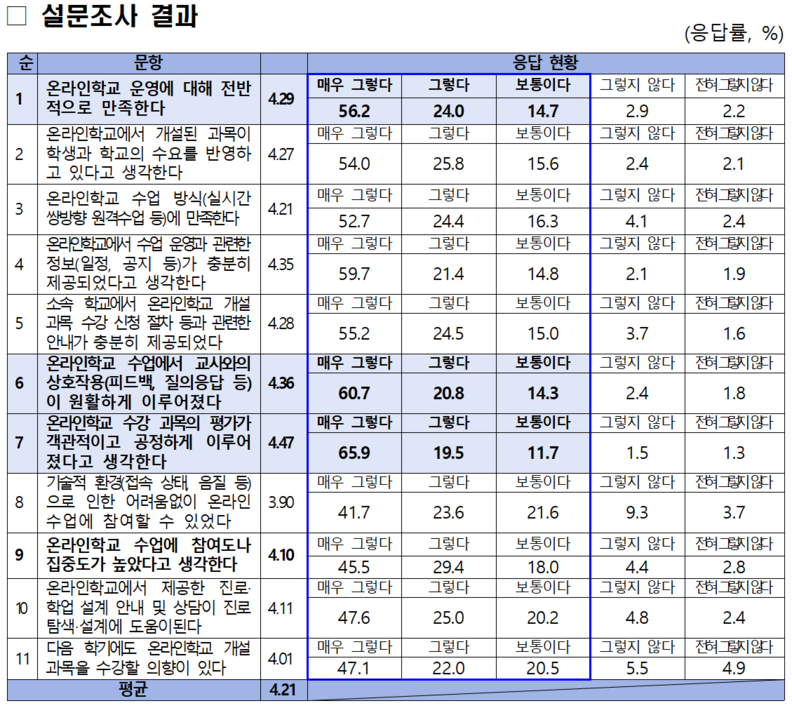 온라인학교 수업의 전반적인 만족도는 4.29점, 온라인학교에서 교사와의 원활한 상호작용에 대한 만족도는 4.36점, 온라인학교 과목 평가의 공정성에 대한 만족도는 4.47점 등으로 각각 조사됐다.