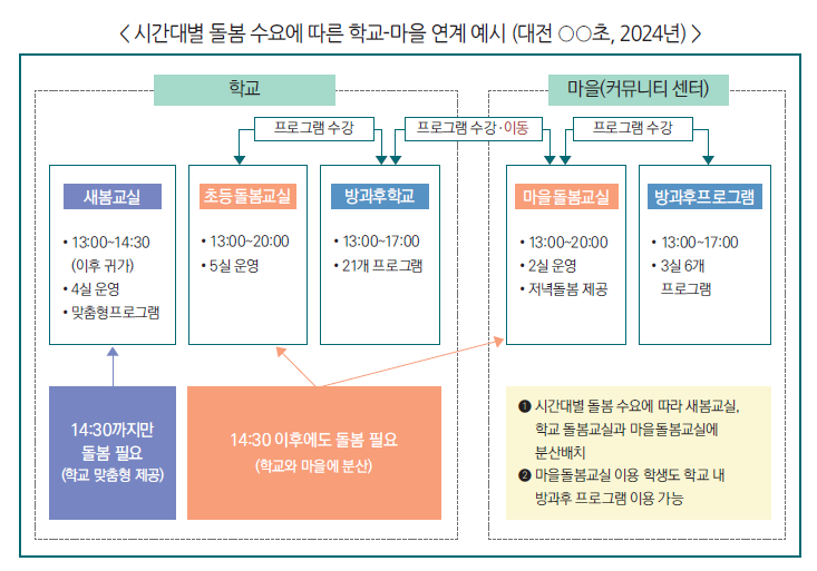 올해부터 전국 초등학교에 배치되고 있는 늘봄지원실장의 역할도 매우 중요하다. 늘봄지원실장은 학교 내 교육·돌봄 수요와 공급 현황을 분석하고, 학교와 연결할 수 있는 인근 지역의 교육·돌봄 서비스가 무엇인지 만남을 통해 파악해야 한다. 또한 학교 내외 자원을 종합적으로 조정하며, 학생과 학부모 수요에 따른 서비스가 적절히 배분되도록 설계하는 코디네이터 역할을 해야 한다. 예를 들어 초등 저학년은 학교 내 공간을 활용해 프로그램을 제공하고, 고학년은 지역의 아파트 커뮤니티 센터를 활용해서 방과후 프로그램을 운영할 수 있다. 돌봄이 필요한 오후 시간대별로 학생과 학부모의 수요를 분석하여 초1~2 맞춤형 프로그램을 제공하거나, 학교와 마을의 공간을 활용한 교육·돌봄 프로그램을 제공할 수 있다.