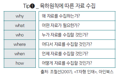 훌륭한 요리사도 좋은 식재료가 있어야 일품요리를 만들 듯이, 기획자도 신선한 자료가 많아야 좋은 기획을 할 수 있다. 기획에 필요한 자료는 육하원칙에 따라 논리적으로 수집한다. 자료는 프레임워크(framework)에 따라 방향을 정한 다음 수집한다. 육하원칙을 이용하면 한 분야에 편중해서 자료를 수집하는 오류도 막을 수 있다. 자료를 수집할 때 알아두어야 할 내용은 다음과 같다.