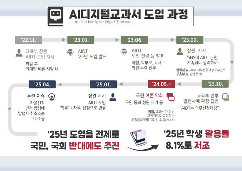 앞서 2023년 1월 교육부는 AIDT 추진계획을 발표한 뒤 2025년 도입을 결정한 바 있다. 하지만 교육부는 의무 도입에 대한 반대 여론 확산에 학교 자율적 도입으로 방향을 틀었다. 지난 8월 국회는 여권 주도로 AIDT를 ‘교과서’ 지위에서 ‘교육자료’로 변경하는 법안을 의결했다.