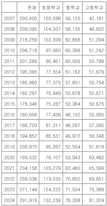 국가데이터처 국가통계포털에 따르면 2024년 사교육비 총액은 29조1919억 원으로, 2014년(18조2297억 원)과 비교해 60.1% 증가했다.