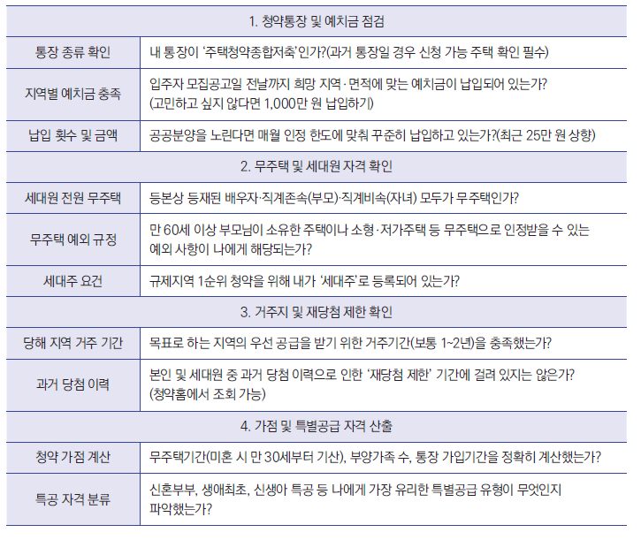 청약 당첨을 위한 필승전략의 첫 단추는 화려한 분석이 아니라, 아주 기초적이고도 철저한 ‘자격 준비’에서부터 시작된다. 아무리 입지 분석을 잘하고 전략적으로 타입을 선택해 당첨의 기쁨을 누린다 한들, 서류상 결격 사유가 발견되어 ‘부적격’ 판정을 받는다면 그 모든 노력은 한순간에 물거품이 되기 때문이다. 따라서 아래의 체크리스트를 통해 기본적인 청약 자격이 잘 갖추어졌는지부터 알아보자.