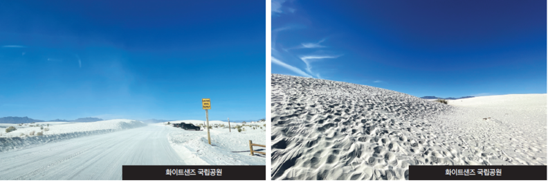 뉴멕시코 남부의 사막을 달리다 보면, 어느 순간 저 멀리서 마치 눈이 내린 듯한 하얀 파도가 시야를 가득 채운다. 이곳이 바로 화이트샌즈 국립공원(White Sands National Park)이다. 이곳의 하얀 모래는 우리가 흔히 떠올리는 모래도, 소금도 아니다. 밀가루처럼 곱고 부드러운 이 흰 입자들은 이 지역의 오랜 지질사가 빚어낸 결과물이다.