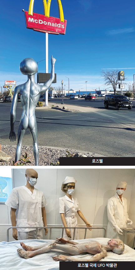 뉴멕시코 동부의 평범한 소도시 로즈웰에 들어서면, 가장 먼저 눈에 들어오는 것은 건물보다도 거리 곳곳에 자리한 외계인의 얼굴이다. 가로등에는 커다란 회색 외계인의 머리가 달려 있고, 상점 간판과 벽화, 기념품 가게의 진열대까지도 외계인 이미지로 가득하다. 한때 조용한 농업 도시였던 이곳은 이제 UFO와 외계인의 도시로 다시 태어났다.