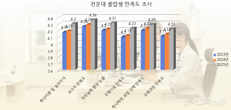 5일 한국전문대학교육협의회(전문대교협, 회장 김영도 동의과학대 총장)가 발표한 ‘2025년도 학사학위 전공심화과정 운영 만족도 조사’ 결과에 따르면, 재학생과 졸업생의 평균 만족도 점수가 전년 대비 일제히 상승했다. 이번 조사는 해당 과정을 운영하는 전국 110개 전문대학의 재학생 1만8906명과 졸업생 1만4026명을 대상으로 실시됐다.