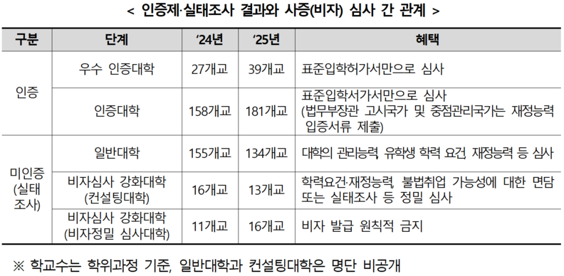 인증대학 외에 외국인 유학생이 1명 이상 재적 중인 대학에 대해서는 ‘유학생 유치·관리 실태조사’ 후 일정 기준을 충족하지 못할 시 비자심사 강화대학(컨설팅대학, 비자정밀 심사대학)으로 지정된다. 이를 통해 대학이 외국인 유학생의 유치 단계에서 어학 능력과 재정 능력 등을 엄격히 심사하도록 하고, 유학생 관리 전반에 대한 대학의 책임을 강화할 예정이다.