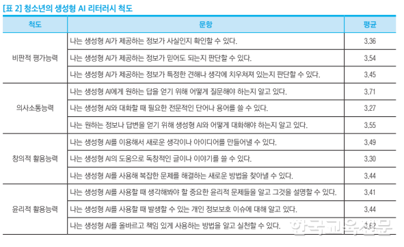 보고서에 따르면 청소년의 생성형 AI 리터러시를 5점 척도로 측정한 결과 모든 세부 문항이 평균 3점을 웃돌았다. 이는 기본적인 활용 이해도와 사용 경험이 상당 수준 축적됐음을 의미한다.