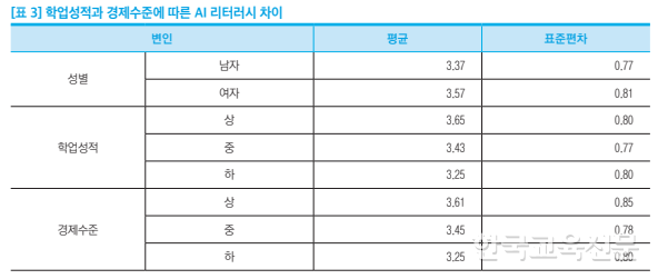 집단 간 격차도 확인됐다. 성별·학업성적·경제수준에 따라 리터러시 수준은 통계적으로 유의미한 차이를 보였다. 여학생이 남학생보다 전반적으로 높았으며, 학업성적이 높을수록 AI 리터러시 점수도 높게 나타났다. 학업성적 ‘상’ 집단 평균은 3.65점, ‘하’ 집단은 3.25점으로 0.40점 차이를 보였다. 가정의 경제수준 역시 긍정적 영향을 미치는 요인으로 분석됐다.