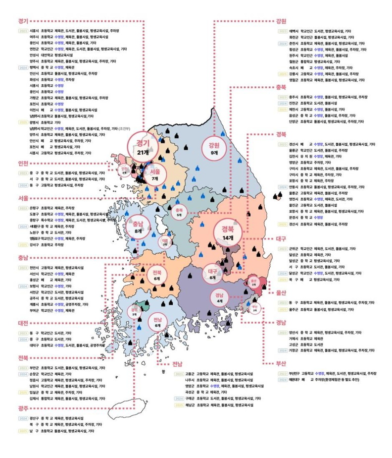 학교복합시설 사업은 교육청-학교-지자체 협력을 통해 교육·문화·체육시설 부족 지역의 학교 또는 폐교에 학생과 지역주민이 함께 이용하는 교육·체육·문화·복지·평생교육 용도의 시설을 설치하는 사업이다. 지난 2023년부터 교육부는 공모를 통해 학교복합시설 99개를 선정했다.
