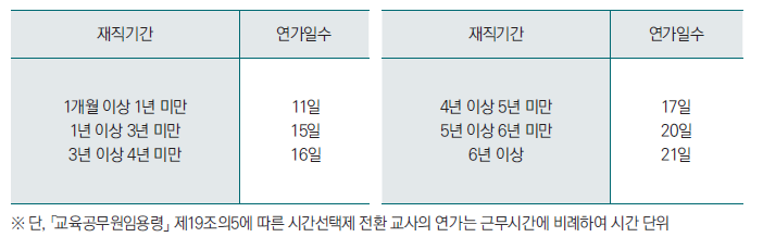 수업일* 중에는 「교원휴가에 관한 예규」 제5조에서 정한 제1호부터 제9호까지의 연가 사유에 해당하는 경우 학교 업무 및 교육과정 운영에 지장을 초래하지 않는 범위 내에서 연가를 사용할 수 있다.