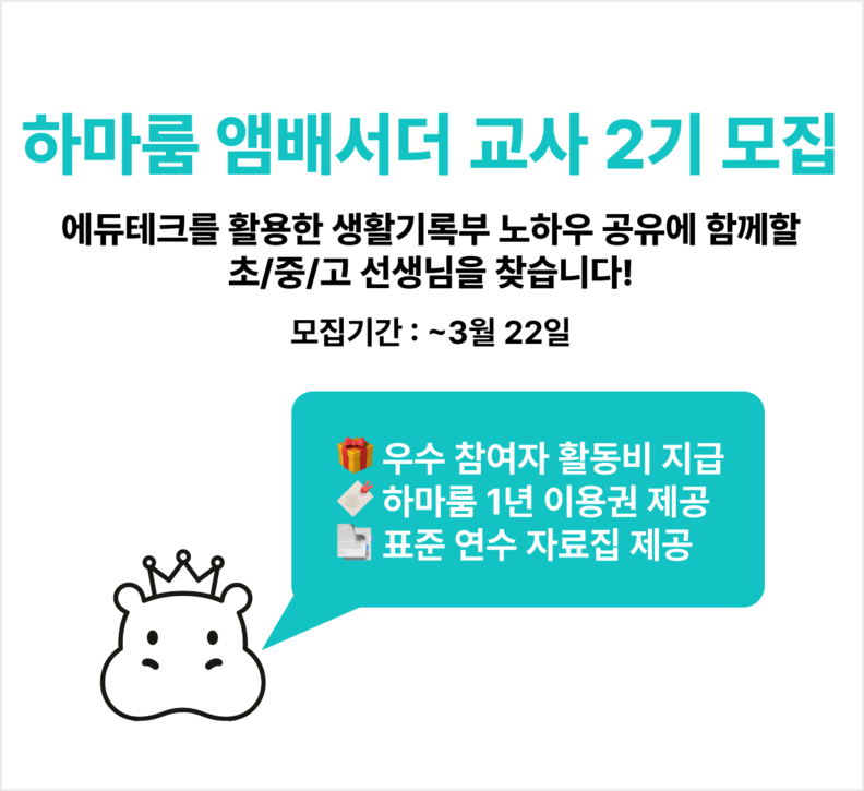 모집 대상은 하마룸 또는 AI를 활용해 생활기록부 작성의 변화를 경험한 전국 초·중·고 현직 교사다. 선발 인원은 10명 내외이며, 3월 22일 자정까지 하마룸 홈페이지 내 정보 게시판에서 신청하면 된다.