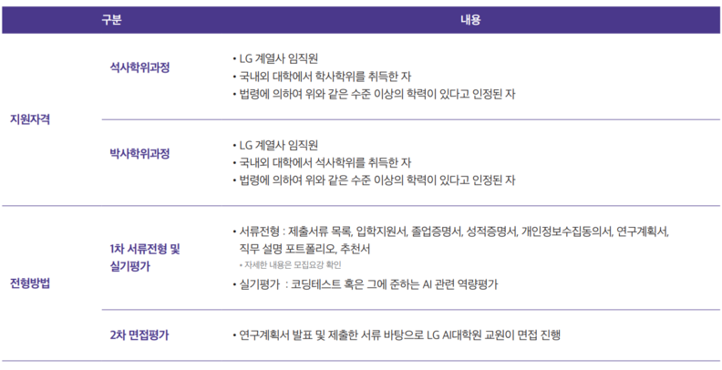 LG AI 대학원은 교육부의 인가를 받아 설치된 최초의 사내대학원으로 AI학과 석사(입학정원 25명) 및 박사(입학정원 5명) 학위과정을 운영한다.