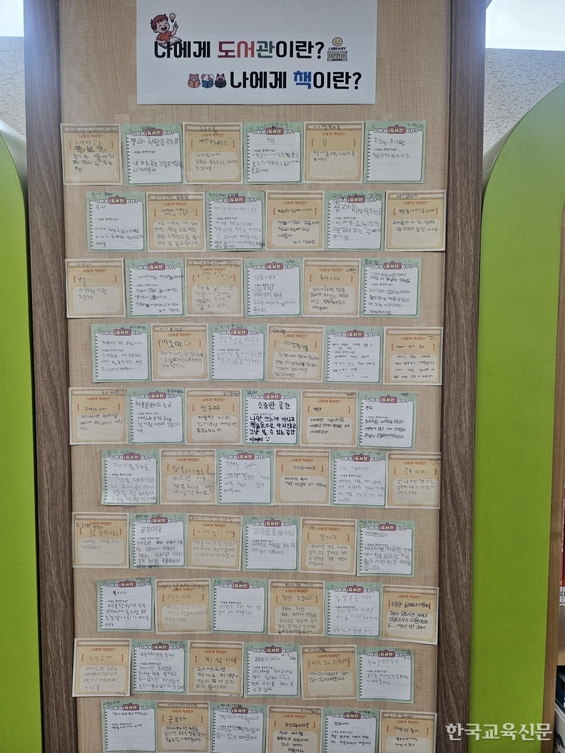 먼저 ‘생각 나누기’ 활동에서는 ‘나에게 도서관이란?’, ‘나에게 책이란?’이라는 질문에 대해 자신의 생각을 작은 메모지에 적어 친구들과 함께 나눴다. 학생들은 도서관을 꿈을 키우는 공간, 책을 마음의 친구라고 표현하며 서로의 생각에 공감하는 시간을 가졌다.
