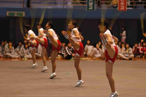 이 날 대회는 개인종목과 단체 종목, 창작 음악 줄넘기 등 3개영역 7종목으로 경기가 진행됐으며, 그 동안 각급학교에서 줄넘기 급수제를 통한, 줄넘기의 날 운영을 통하여 평소에 익힌 실력을 교내 대회를 통하여 선발된 학생들이 참여했다. 사진은 창작음악줄넘기 부분에 참가한 부평정보고 학생들의 음악에 맞추어 묘기를 보여주고 있는 모습.