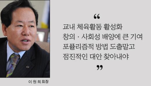 이원희 회장=맞습니다. 학교 내에서의 체육활동은 학생들의 창의적 사고와 사회성 배양에도 많은 도움이 됩니다. 학교체육 활성화가 여러 청소년 문제 해결에도 기여할 수 있을텐데 말이죠. 교육과정 속에서 어떤 변화가 모색되어야 한다고 보시는지요?