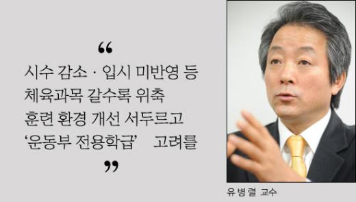 유병렬 교수=교육과정이 바뀌면서 중학교 3학년 학생들은 한 주에 3시간에서 2시간으로, 고등학교 2ㆍ3학년의 경우 필수에서 선택으로 체육 수업에 대한 할당량 자체가 축소됐고 여학생의 경우 거의 체육수업을 선택하지 않는 것으로 나타나고 있습니다. 체육과목의 시수 감소 또는 전무의 형태로 변질 되어가고 있다고 봐야합니다. 시설적인 측면에서도 신설된 학교의 경우는 운동장이 몹시 협소하여 직선이 50m도 채 안 나오는 학교도 있다고 하니 체육 수업에 대한 제한이 많다고 봐야할 것입니다.