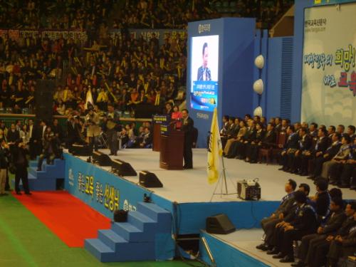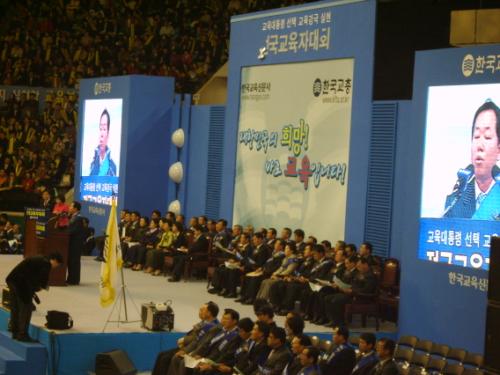 한국교총 창립 60주년을 맞이하여 열린 전국교육자대회가 10일 오후 2시부터 서울 잠실학생체육관에서 개최되었다. 이날 대회에는 전국에서 교원 8천여명-1만여명(리포터 추정)이 참가하여 체육관은 입추의 여지없이 교원들로 자리가 모두 채워졌다. 대회에는 이원희 한국교총회장을 비롯하여 대통합민주신당의 정동영 대통령후보와 한나라당 이명박후보 및 전국의 시,도교총회장, 전국에서 상경한 교원들이 참가하여 대성황을 이루었다.