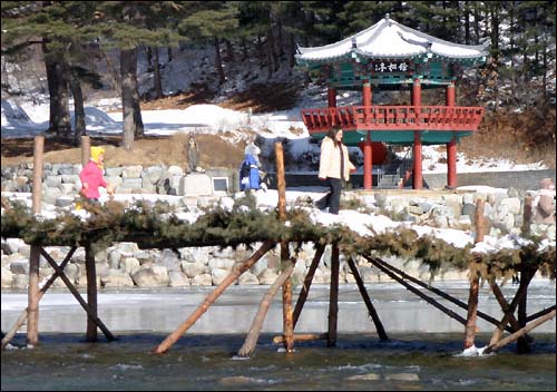 꽁꽁 얼어붙은 강물 위에 하얀 눈이 뒤덮여 있어 물을 건너는 다리가 아니라 눈을 건너는 다리라고 해야 맞는 표현이다. 다리 위에도 하얀 눈이 수북히 쌓여있어 겨울 정취를 더한다. 강변에는 아우라지 노래비와 아우라지 처녀상, 정자인 여송정이 세워져 있다.